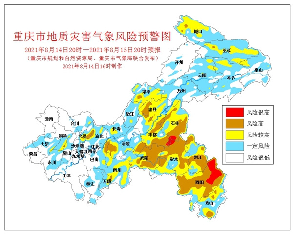 人民網重慶8月14日電 8月14日16時,重慶市規(guī)劃和自然資源局、重慶市氣象局聯(lián)合發(fā)布全市地質災害氣象風險預警。
