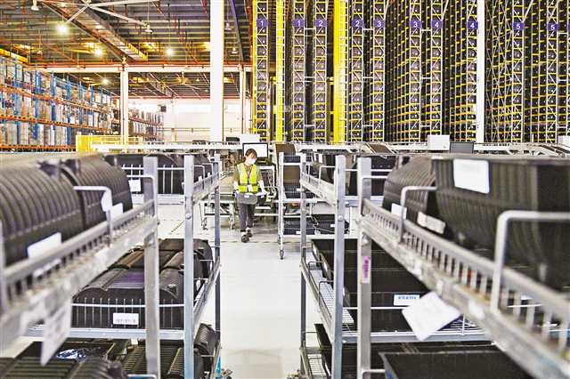 重慶飛力達(dá)供應(yīng)鏈自動(dòng)化立體倉(cāng)庫(kù),整個(gè)工作場(chǎng)地只有幾個(gè)工人在分揀貨物。記者 崔力 攝/視覺(jué)重慶