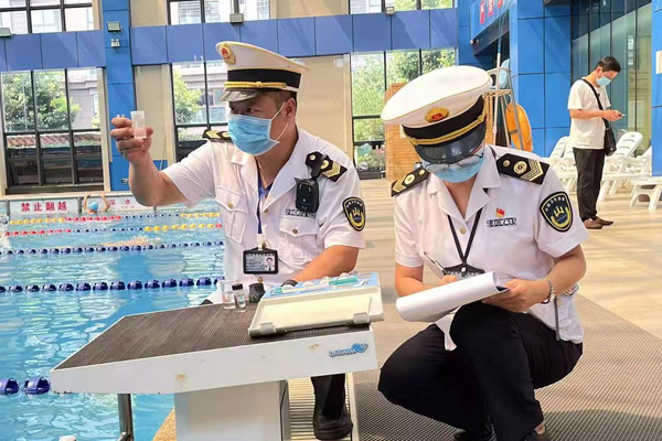 衛(wèi)生監(jiān)督員檢查游泳場所衛(wèi)生現(xiàn)場。榮昌區(qū)衛(wèi)生健康執(zhí)法支隊供圖