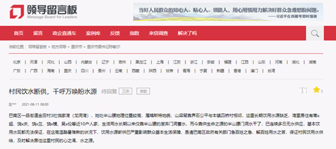 8月11日,蔣志超和當(dāng)?shù)卮迕裢ㄟ^人民網(wǎng)“領(lǐng)導(dǎo)留言板”給重慶市委書記陳敏爾留言,反映了群眾生活用水得不到保障的問題。希望相關(guān)部門及時解決居住在這里村民的“吃水難”。