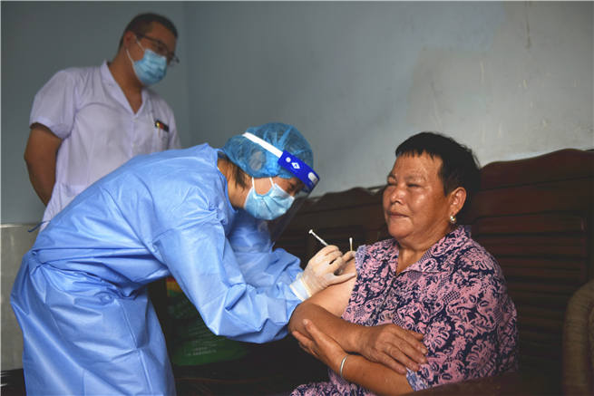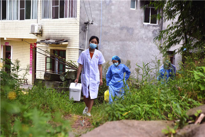 在三江街道龍?zhí)链澹?dāng)?shù)厣鐓^(qū)衛(wèi)生服中心的醫(yī)務(wù)人員挨家挨戶為村民宣傳和疫苗接種。