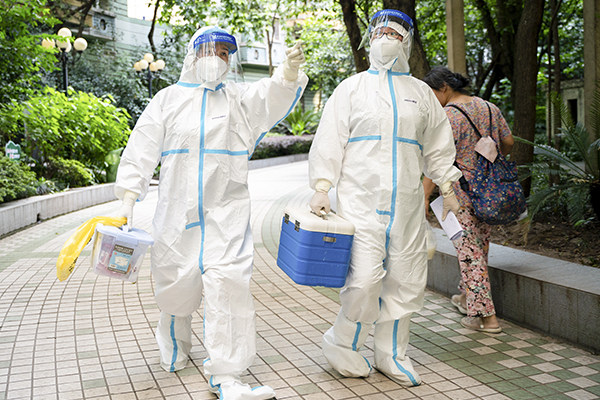 醫(yī)護(hù)人員頂著高溫,進(jìn)行入戶采樣。重慶醫(yī)藥高等?茖W(xué)校附屬第一醫(yī)院供圖