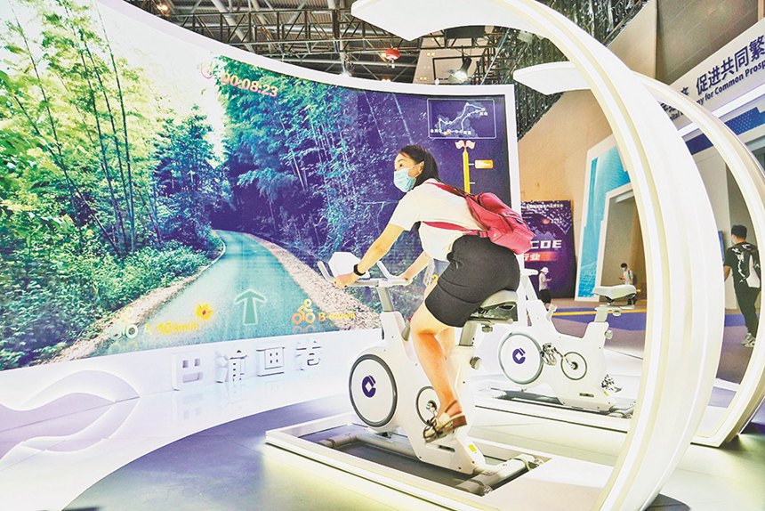 8月22日,重慶國(guó)博中心2021智博會(huì)現(xiàn)場(chǎng),媒體記者體驗(yàn)單車漫游“巴渝畫卷”。