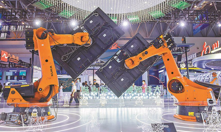 八月二十三日,在重慶國際博覽中心,二○二一中國國際智能產(chǎn)業(yè)博覽會展場,兩臺機(jī)器人“揮舞”著顯示屏進(jìn)行視頻組合展示智能制造。記者 張錦輝 攝\視覺重慶