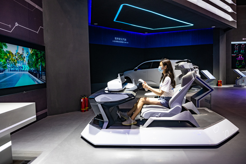參觀者體驗長安智慧數(shù)字座艙。鄒樂攝