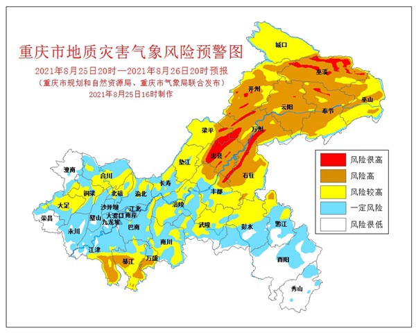 8月25日20時至8月26日20時,巫溪縣、奉節(jié)縣、萬州區(qū)、開州區(qū)、石柱縣、豐都縣、梁平區(qū)、忠縣、城口縣、云陽縣屬于風險很高地區(qū),地質災害氣象風險等級為一級(紅色預警),江津區(qū)、綦江區(qū)、萬盛經開區(qū)、黔江區(qū)、巫山縣屬于高風險地區(qū),地質災害氣象風險等級為二級(橙色預警),長壽區(qū)、墊江縣、彭水縣、大足區(qū)、秀山縣、合川區(qū)、北碚區(qū)、武隆區(qū)、渝北區(qū)、潼南區(qū)、榮昌區(qū)、銅梁區(qū)、巴南區(qū)、永川區(qū)、南川區(qū)、涪陵區(qū)、璧山區(qū)、南岸區(qū)屬于風險較高地區(qū),地質災害氣象風險等級為三級(黃色預警),渝中區(qū)、大渡口區(qū)、九龍坡區(qū)、兩江新區(qū)、沙坪壩區(qū)、江北區(qū)、酉陽縣屬于一定風險地區(qū),地質災害氣象風險等級為四級(藍色預警)。