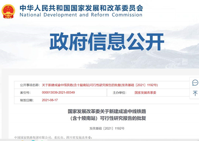 人民網重慶8月25日電 (劉政寧、周小平)日前,國家發(fā)展改革委官網發(fā)布《關于新建成渝中線鐵路(含十陵南站)可行性研究報告的批復》(以下簡稱《批復》)。