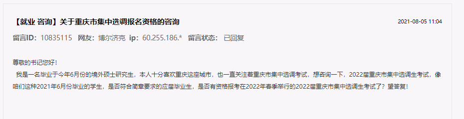 該網(wǎng)友在留言中稱:本人十分喜歡重慶這座城市,也一直關(guān)注著重慶市集中選調(diào)考試,想咨詢一下,2022屆重慶市集中選調(diào)生考試,像咱們這種2021年6月份畢業(yè)的學(xué)生,是否符合簡(jiǎn)章要求的應(yīng)屆畢業(yè)生,是否有資格報(bào)考在2022年春季舉行的2022屆重慶市集中選調(diào)生考試了?望答復(fù)!
