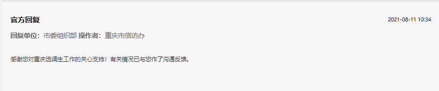 對(duì)此,重慶市委組織部看到留言后,及時(shí)與該網(wǎng)友進(jìn)行了溝通聯(lián)系;貜(fù):“感謝您對(duì)重慶選調(diào)工作的關(guān)心支持!有關(guān)情況已與您作了溝通反饋”。