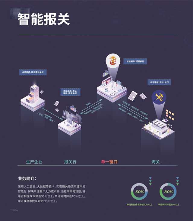 以“智能報(bào)關(guān)”為例。重慶“單一窗口”在全國首次引入RPA流程自動(dòng)化機(jī)器人,單證處理時(shí)間由每票40分鐘縮短到40秒,單證效率提高80%以上,單證成本降低50%以上。