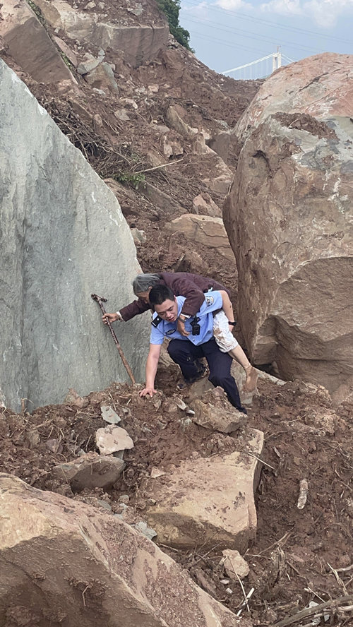 民警背著老人艱難地穿過(guò)塌方路段。萬(wàn)州區(qū)公安局供圖