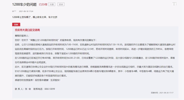 8月17日,有網(wǎng)友在人民網(wǎng)“領(lǐng)導(dǎo)留言板”上給重慶市大渡口區(qū)委領(lǐng)導(dǎo)留言:“1288早上發(fā)車晚了,晚上收車太早,車少太擠!