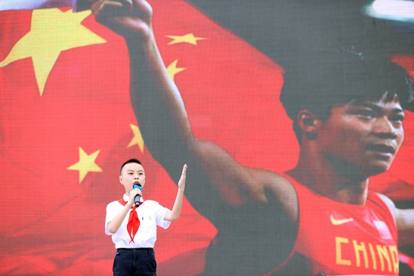 學生代表講述中國飛人蘇炳添的故事。重師附二小供圖