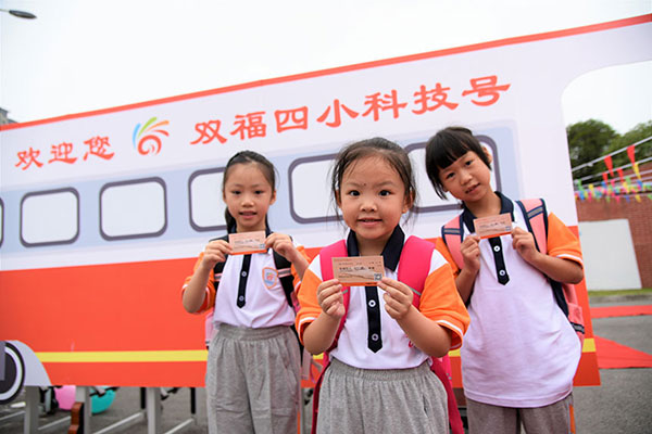 在江津雙福四小,新生們從老師手中領(lǐng)取一張科技號列車的車票,踏上列車。此趟列車途經(jīng)匯融站、涵品站、慧智站三個車站,幫助學(xué)生了解校園文化。