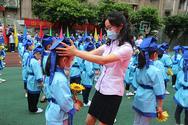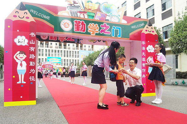 向陽小學(xué)340名一年級新生參加開學(xué)典禮,獲贈《向陽君子規(guī)》和象征學(xué)校文化的向陽花。隨后,在家長的陪伴下跨過啟蒙之門、啟德之門、啟智之門,正式成為小學(xué)生。
