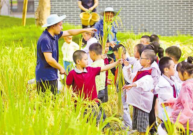9月2日,兩江新區(qū)童心青禾小學(xué)全校594名小學(xué)生上了一堂特殊的勞動(dòng)課——校園里,師生們共同種植的稻子成熟了,孩子們興奮地和老師一起下田收稻谷、撻谷子,感受什么叫粒粒皆辛苦。
