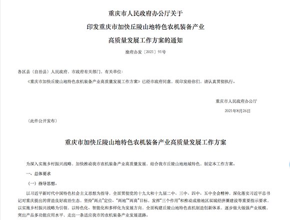 近日,重慶市政府發(fā)布《重慶市加快丘陵山地特色農(nóng)機(jī)裝備產(chǎn)業(yè)高質(zhì)量發(fā)展工作方案》(以下簡(jiǎn)稱《方案》),結(jié)合重慶丘陵山地地域特色,提出到2025年,全市農(nóng)機(jī)裝備產(chǎn)業(yè)規(guī)模突破200億元的發(fā)展目標(biāo)。