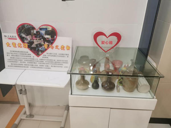 在交行重慶西永支行,“大愛無疆 愛心義賣角”引人注目,形態(tài)各異、做工精致的陶藝品陳列其中。