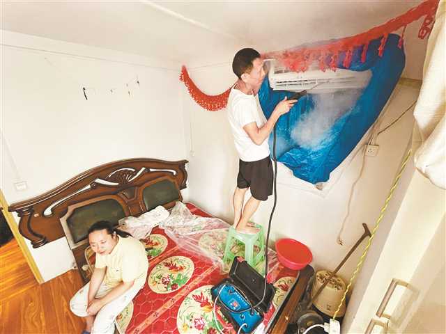 萬州區(qū)鐘鼓樓街道桑樹社區(qū)廉租房小區(qū),社區(qū)便民服務(wù)隊免費(fèi)為因病致盲的居民清洗空調(diào)。