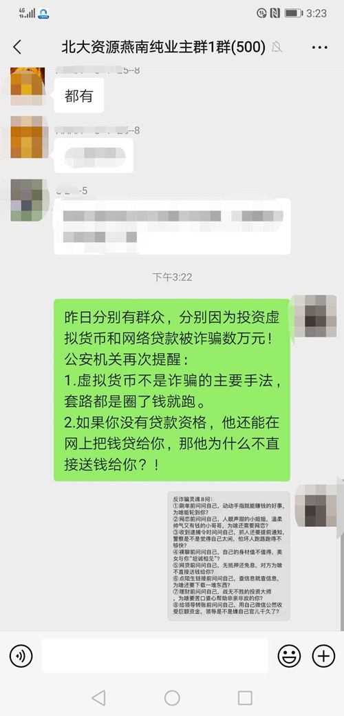 “事實(shí)上,很多電信詐騙都是發(fā)生在微信群中,比如刷單群、投資群!本琵埮沙鏊彼L馮牧介紹,“既然潛在受害人都是喜歡玩微信群聊的人,那么我們的宣防陣地也應(yīng)該轉(zhuǎn)移到線上,各個(gè)小區(qū)業(yè)主群的群主都是小區(qū)的‘名人’,也時(shí)刻關(guān)注著群消息,他們的號召力和活躍度正是我們可以借助的力量!