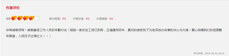 家人收到拖欠工資后,9月3日,嚴(yán)女士再次給《領(lǐng)導(dǎo)留言板》留言!胺浅8兄x領(lǐng)導(dǎo)!感謝基層工作人員的辛勤付出!姐姐一家拖欠工資已到賬,正值建黨百年,真切的感受到了為老百姓辦實(shí)事的決心與力度!真心祝福我們的祖國繁榮昌盛,人民日子過得紅火!”