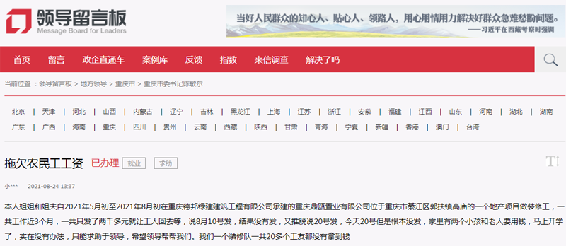 在嚴(yán)女士首次留言中說到:“姐姐和姐夫自2021年5月初至2021年8月初在位于重慶市綦江區(qū)郭扶鎮(zhèn)高廟的一個(gè)地產(chǎn)項(xiàng)目做裝修工,一共工作近3個(gè)月,只發(fā)了兩千多元就讓工人回去等,說8月10號(hào)發(fā),過了20號(hào)也沒發(fā)。家里有兩個(gè)小孩和老人要用錢,馬上開學(xué)了,希望領(lǐng)導(dǎo)幫我們討回工資!