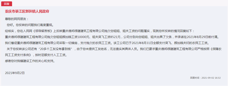 官方回復(fù)中稱:經(jīng)核實(shí),您在人民網(wǎng)《領(lǐng)導(dǎo)留言板》上反映重慶德邦綠建建筑工程有限公司拖欠姐姐、姐夫工資的問題屬實(shí)。我們督促該公司采取一切措施,支付拖欠的農(nóng)民工工資。該公司已于2021年8月31日全額支付吳飛、顏加娥夫婦的農(nóng)民工工資。同時(shí),要求公司嚴(yán)格按照《保障農(nóng)民工工資支付條例》,按時(shí)足額支付其余工友工資。感謝您對(duì)我鎮(zhèn)建設(shè)工作的關(guān)心和支持。