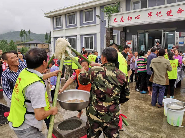 活動中,村民們與干部們或兩人一組、或三人一團,圍著石舂,快速而賣力地打起了糍粑。短短10多分鐘,熱氣騰騰的糍粑就大功告成,干部們一一分裝,并加入黃粉和白糖,隨后與居民一起開心享用這一傳統(tǒng)美食。