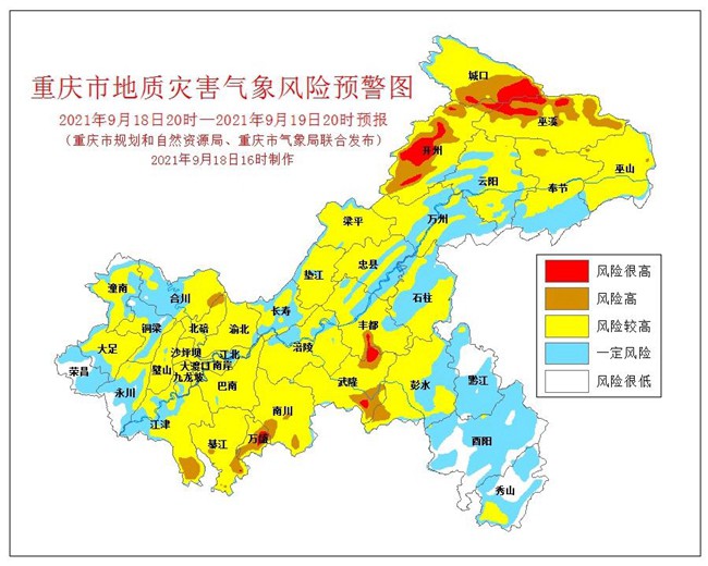 9月18日20時(shí)至9月19日20時(shí),武隆區(qū)、巫溪縣、開(kāi)州區(qū)、城口縣、豐都縣、萬(wàn)盛經(jīng)開(kāi)區(qū)屬于風(fēng)險(xiǎn)很高地區(qū),地質(zhì)災(zāi)害氣象風(fēng)險(xiǎn)等級(jí)為一級(jí)(紅色預(yù)警),江津區(qū)、綦江區(qū)、彭水縣、合川區(qū)、北碚區(qū)、南川區(qū)、奉節(jié)縣屬于高風(fēng)險(xiǎn)地區(qū),地質(zhì)災(zāi)害氣象風(fēng)險(xiǎn)等級(jí)為二級(jí)(橙色預(yù)警),大足區(qū)、秀山縣、梁平區(qū)、潼南區(qū)、銅梁區(qū)、璧山區(qū)、永川區(qū)、渝北區(qū)、萬(wàn)州區(qū)、石柱縣、忠縣、長(zhǎng)壽區(qū)、墊江縣、涪陵區(qū)、南岸區(qū)、渝中區(qū)、江北區(qū)、巫山縣、云陽(yáng)縣、巴南區(qū)、黔江區(qū)、兩江新區(qū)、大渡口區(qū)、沙坪壩區(qū)、九龍坡區(qū)屬于風(fēng)險(xiǎn)較高地區(qū),地質(zhì)災(zāi)害氣象風(fēng)險(xiǎn)等級(jí)為三級(jí)(黃色預(yù)警),酉陽(yáng)縣、榮昌區(qū)屬于一定風(fēng)險(xiǎn)地區(qū),地質(zhì)災(zāi)害氣象風(fēng)險(xiǎn)等級(jí)為四級(jí)(藍(lán)色預(yù)警)。