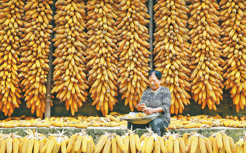 9月14日,黔江區(qū)濯水鎮(zhèn)五福村,村民在院壩晾曬玉米。秋收時(shí)節(jié),黔江農(nóng)民把收獲的玉米掛在屋檐下、吊腳樓上進(jìn)行晾曬,一派豐收景象。