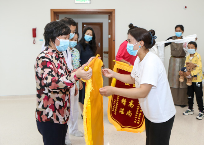 鄧?yán)蚋敝魅我恍锌赐藖碛逯委煹?5位患兒,并為他們送上嶄新的書包和文具。并與患兒家長熱情交談,詳細(xì)了解患兒恢復(fù)情況;純杭覍俅碜楷敽屯贩謩e向重慶市衛(wèi)健委和重醫(yī)附屬兒童醫(yī)院贈送了錦旗,并獻上了潔白的哈達(dá)表示感謝。(陳琦、白楊)