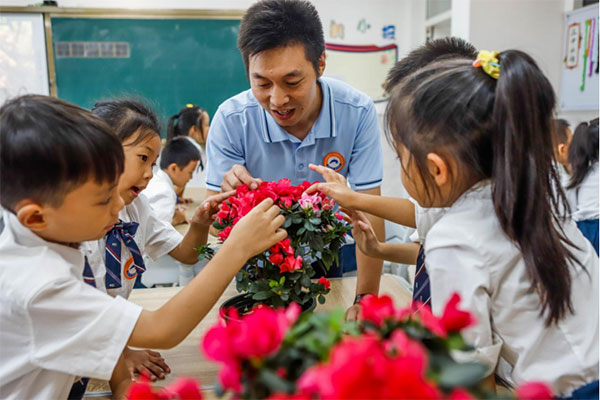 老師帶領(lǐng)孩子了解杜鵑花。重光小學(xué)供圖