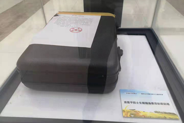 在展覽現(xiàn)場,一個展柜中的“密碼箱”格外引人注目。西南大學博物館副館長鄭勁松介紹:“這個密碼箱是1996年袁老購買的,十多年一直跟隨他到處工作。”雖有多處磨損,但袁老一直舍不得扔,2008年10月27日,是西南大學合并改名后,袁老第一次回到母校,回來后他準備給全校師生做雜交水稻新成果的報告。結(jié)果箱子因為年久磨損無法打開,為了取資料,只好把箱子撬開。學校隨后送給袁隆平一個新的手提箱,而這個舊的手提箱就留在了學校,被校史館保存了下來。