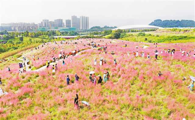 9月29日,兩江新區(qū)禮嘉智慧公園,市民在粉黛亂子草花海游玩。智慧公園的優(yōu)美生態(tài)和眾多智慧體驗(yàn)場(chǎng)景、智慧體驗(yàn)項(xiàng)目,每天吸引2萬(wàn)多游客前來(lái)打卡,爭(zhēng)相體驗(yàn)“智慧+生態(tài)”的獨(dú)特魅力。