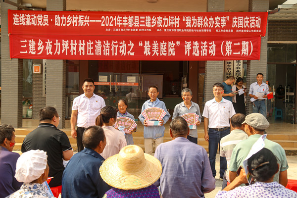 人民網(wǎng)重慶10月1日電 9月27日,一場別開生面的活動在豐都縣三建鄉(xiāng)夜力坪村委廣場舉行;顒佑韶S都縣三建鄉(xiāng)夜力坪村兩委、駐村工作隊、重慶城市管理職業(yè)學(xué)院民政與社會治理學(xué)院主辦,社工專業(yè)黨支部、四葉草社會工作服務(wù)站承辦;顒硬扇【上線下形式,圍繞“學(xué)黨史 我為群眾辦實事”開展,包含“紅色鄉(xiāng)村”“法治鄉(xiāng)村”“美麗鄉(xiāng)村”三個篇章。