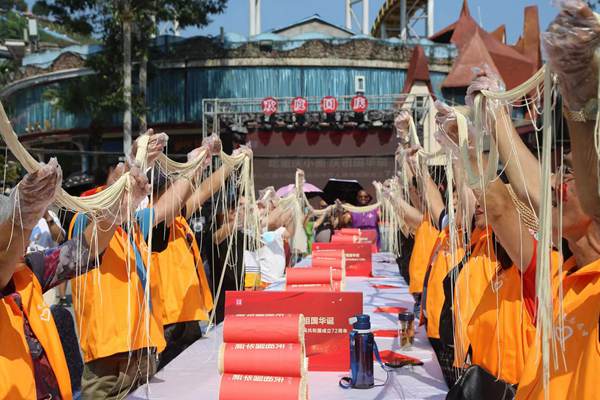 該景區(qū)還特別邀請(qǐng)了養(yǎng)老院的老人、周邊村落的老人、環(huán)衛(wèi)工人、建筑工人和市民游客朋友們共同參加“慶生長(zhǎng)桌宴”,免費(fèi)品嘗全手工制作的“國(guó)慶長(zhǎng)壽面”。長(zhǎng)壽面總長(zhǎng)72米,煮成100碗重慶特色小面,供游客們免費(fèi)品嘗。