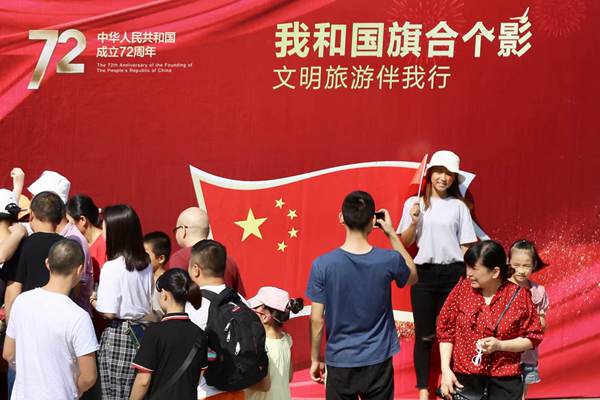 人民網(wǎng)重慶10月2日電 (馮文彥)與國(guó)旗合影、吃長(zhǎng)壽面……1日,涪陵美心紅酒小鎮(zhèn)景區(qū)舉行主題活動(dòng),邀請(qǐng)游客一起為新中國(guó)慶生,為祖國(guó)獻(xiàn)上祝福。當(dāng)天一早,伴隨悠揚(yáng)的《歌唱祖國(guó)》歌聲響起,紅酒小鎮(zhèn)景區(qū)廣場(chǎng)上的游客們手搖國(guó)旗,一起歌唱祖國(guó),主題活動(dòng)由此拉開(kāi)帷幕。