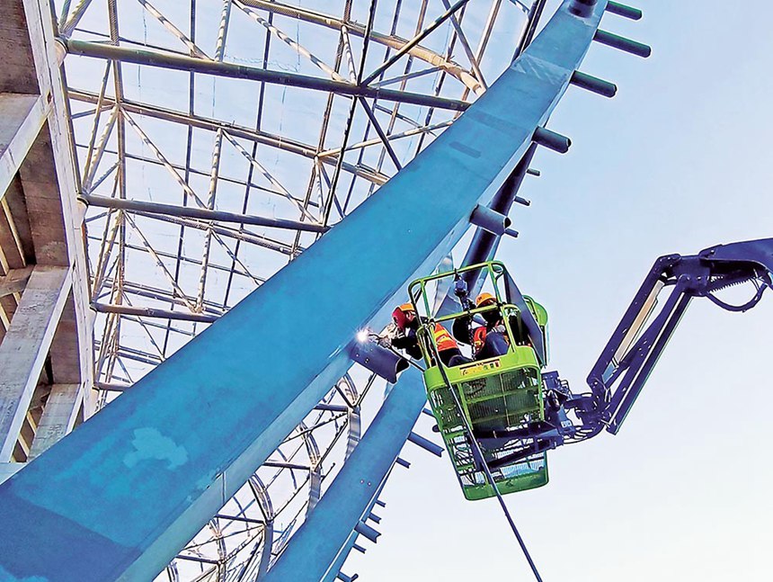 10月1日,重慶龍興足球場(chǎng)建設(shè)工地,工人正進(jìn)行高空作業(yè)。(中建八局供圖)