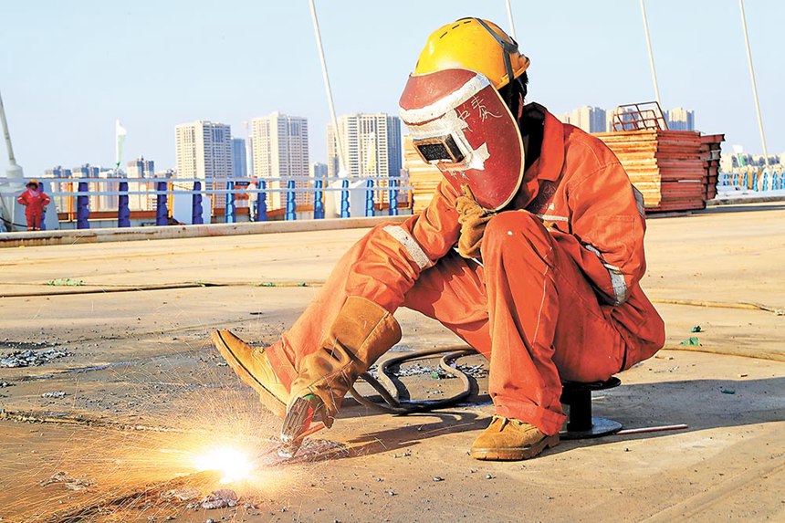 10月1日上午,白居寺長(zhǎng)江大橋項(xiàng)目工地,焊接工人正在緊張工作。(中交二航局供圖)