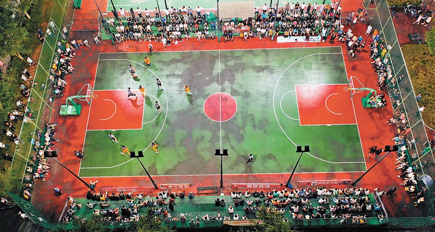 10月2日晚,梁平區(qū)全民健身中心旁的露天球場,市民參加籃球比賽。國慶假期,不少市民走進(jìn)體育場所,跑步、踢足球、打籃球、打太極拳等,鍛煉身體,放松心情,愉快度假。特約攝影 劉輝/視覺重慶