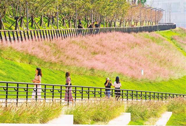 10月5日,剛投用的江北嘴江灘公園一期吸引不少游客打卡。