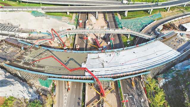 10月5日,西部(重慶)科學(xué)城科學(xué)大道一期青龍咀立交施工現(xiàn)場,工人正在進(jìn)行混凝土澆筑。