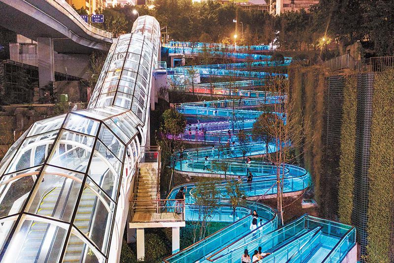 10月9日晚,渝中區(qū)東水門大橋北橋頭,無障礙景觀步道燈飾扮靚江岸。景觀步道連接陜西路和長濱路,已于國慶節(jié)前夕投用,市民通過步道可以快速到達湖廣會館。步道兩側和崖壁都栽種了不少植物,形成了一處極具山城特色的坡坎崖景觀。