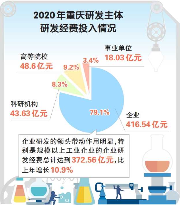 《公報(bào)》顯示,整個(gè)“十三五”時(shí)期,重慶研發(fā)經(jīng)費(fèi)始終保持兩位數(shù)增長(zhǎng)。企業(yè)、科研機(jī)構(gòu)、高等學(xué)校和事業(yè)單位,是全市開(kāi)展研發(fā)活動(dòng)的主體。市統(tǒng)計(jì)局負(fù)責(zé)人介紹,去年全市企業(yè)、科研機(jī)構(gòu)、高等院校、事業(yè)單位分別投入研發(fā)經(jīng)費(fèi)為416.54億元、43.63億元、48.6億元、18.03億元,占全市研發(fā)經(jīng)費(fèi)比重分別為79.1%、8.3%、9.2%、3.4%,企業(yè)研發(fā)的領(lǐng)頭帶動(dòng)作用明顯,特別是規(guī)模以上工業(yè)企業(yè)的企業(yè)研發(fā)經(jīng)費(fèi)總計(jì)達(dá)到372.56億元,比上年增長(zhǎng)10.9%。
