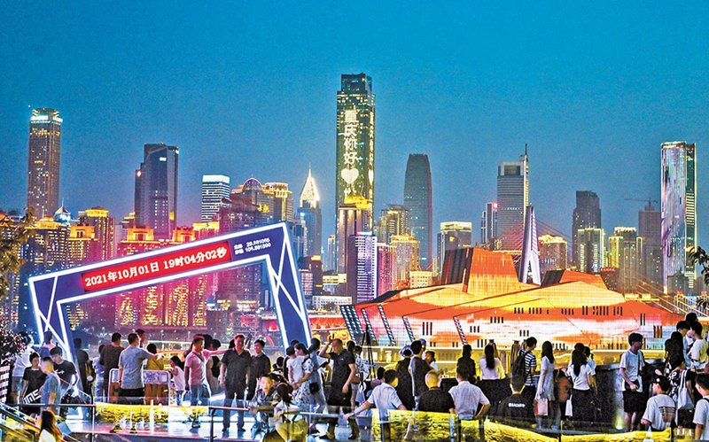 10月1日,南岸區(qū)長嘉匯,游客正在欣賞兩江四岸美麗的夜景。首席記者 龍帆 攝/視覺重慶