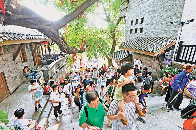 10月2日,游客正在新開街的渝中區(qū)十八梯傳統(tǒng)風(fēng)貌區(qū)游覽。特約攝影 鐘志兵/視覺重慶