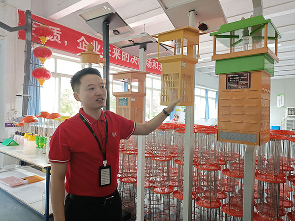 本樂科技負(fù)責(zé)人介紹公司研制的一體化智能殺蟲燈。李金攝