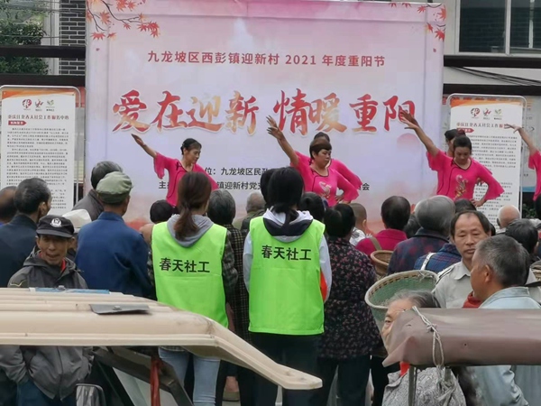 在九龍坡區(qū)西彭鎮(zhèn)上腰鼓《活力中國》、舞蹈《天南地北唱中華》和合唱《沒有共產(chǎn)黨就沒有新中國》熱鬧了迎新村便民服務(wù)中心。重慶江北春天社會工作服務(wù)中心聯(lián)合迎新村村委會開展的敬老活動為當(dāng)?shù)氐睦先藗兯腿チ斯?jié)日的祝福。為村內(nèi)老人送上米、油、銀齡包等慰問品,并對村內(nèi)孤寡老人進(jìn)行入戶慰問,為村內(nèi)老人送上真切的問候。