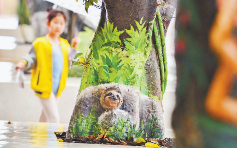 近日,解放碑步行街,市民從樹繪旁走過。這些樹繪有熊貓、浣熊、大象等動(dòng)物造型,都是樹繪創(chuàng)作者結(jié)合樹體形態(tài)巧妙繪制而成,給原本單調(diào)的行道樹增添不少趣味。