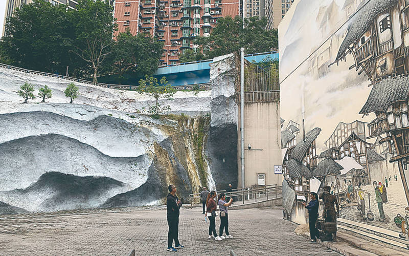 相比一側(cè)的山水畫,另一側(cè)的吊腳樓畫作更有一種生活和情懷。峭壁上,是一幅長高約為10米的巨型老重慶風(fēng)貌畫,畫中有層層疊疊的吊腳樓,也有挑著扁擔(dān)走街的挑夫,還有坐在棚下喝茶休閑的人……看到這幅畫,滿滿的回憶感撲面而來。